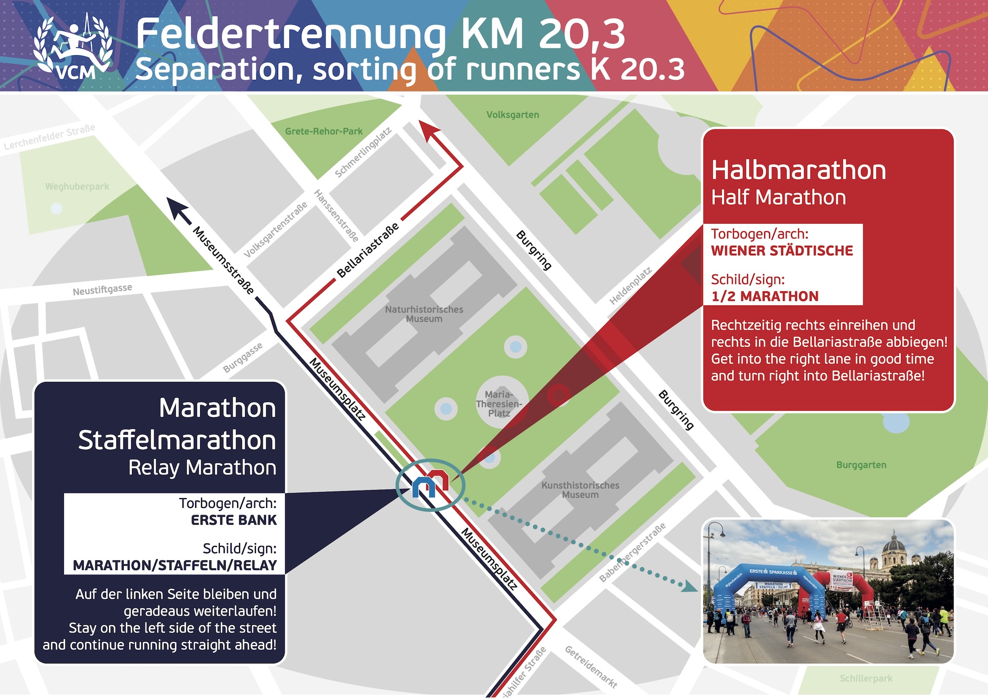 Der Marathon und der Wiener Städtische Halbmarathon laufen auf der gleichen Strecke. Die Trennung der Felder erfolgt bei KM 20,3 und ist mit Ankündigungstafeln beschildert.