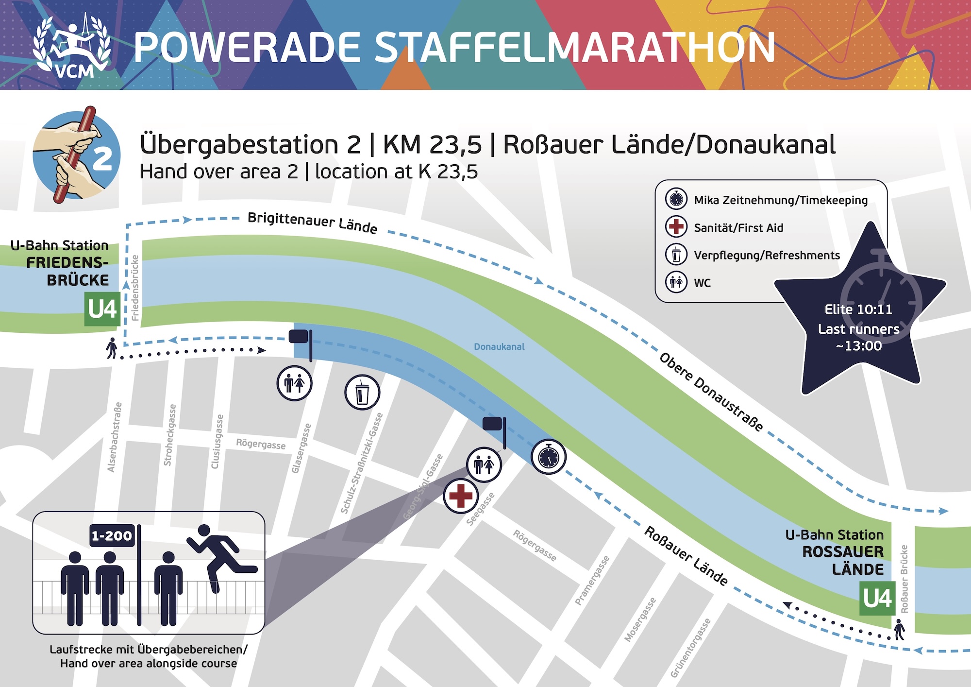 Der Marathon und der Wiener Städtische Halbmarathon laufen auf der gleichen Strecke. Die Trennung der Felder erfolgt bei KM 20,3 und ist mit Ankündigungstafeln beschildert.