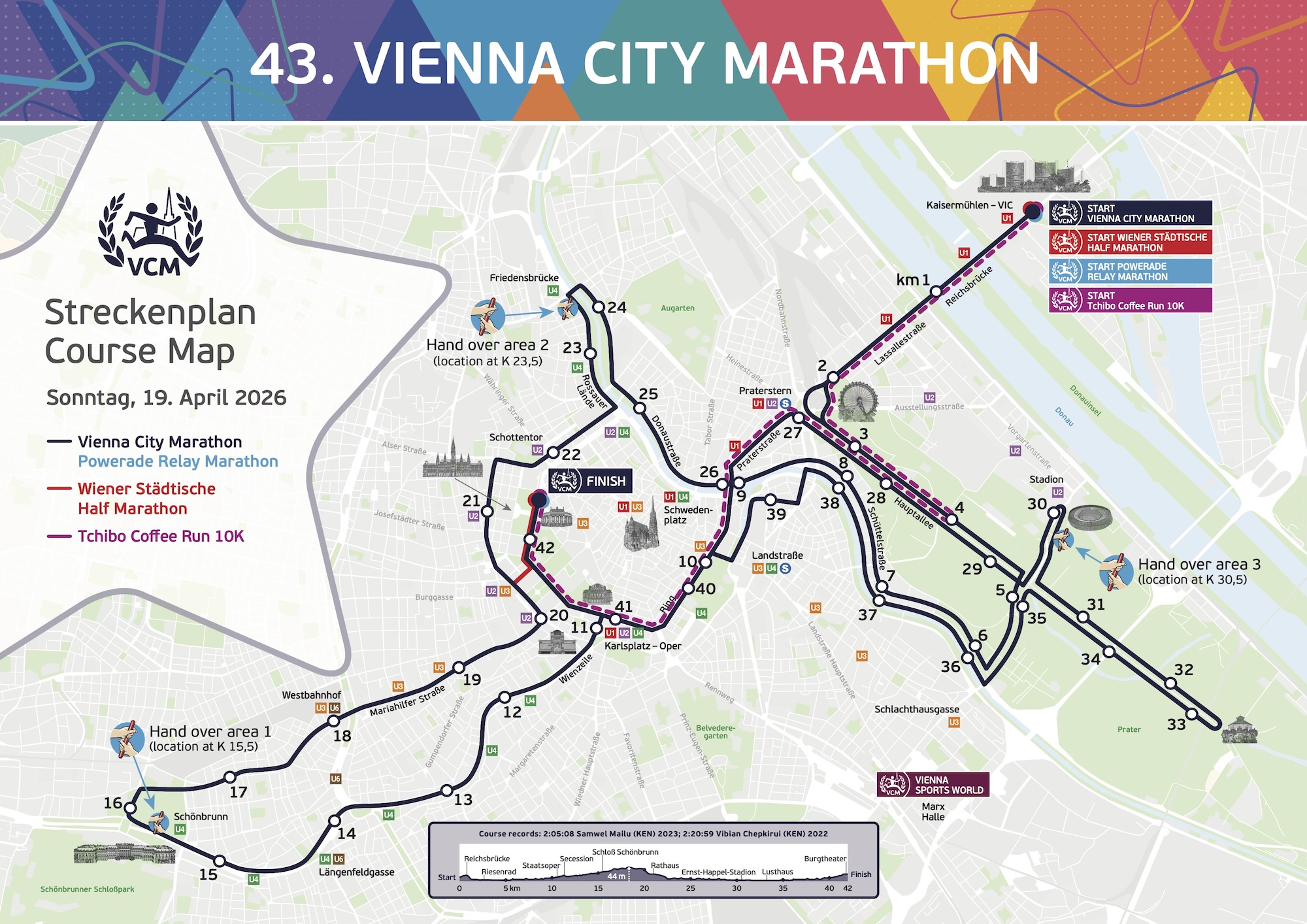 Der Vienna City Marathon ist ein attraktiver und abwechslungsreicher Stadtkurs, auf dem du schnelle Zeiten laufen kannst. Die Differenz zwischen dem niedrigsten und dem höchsten Punkt der Strecke beträgt nur 44 Meter.