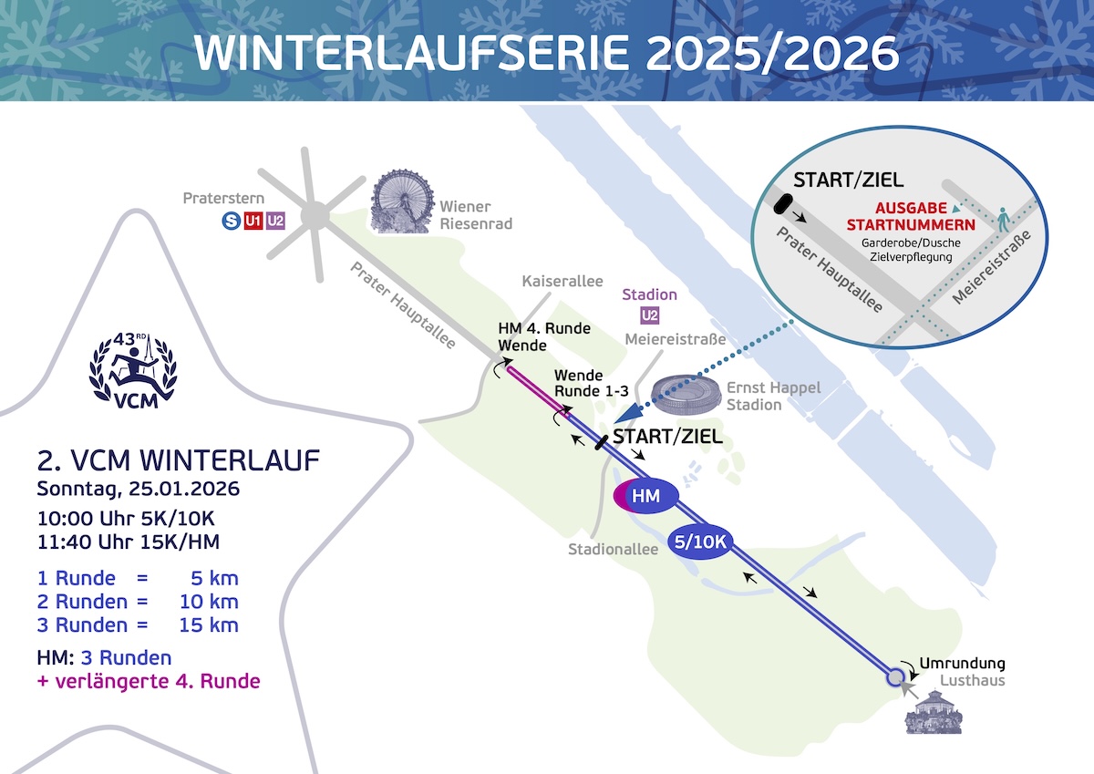 Wir möchten die langfristige Anmeldung & Vorbereitung für den Vienna City Marathon "belohnen". Daher werden wir unter allen „VCM-Winterläufer*innen“, die bis 6. Jänner bereits für den Marathon oder Wiener Städtische Halbmarathon beim VCM 2026 angemeldet sind, 100 Startplätze für den Lauf am 25. Jänner verlosen. Die Gewinner*innen werden benachrichtigt, Sie erhalten noch vor dem Bewerb das Nenngeld zurückerstattet.