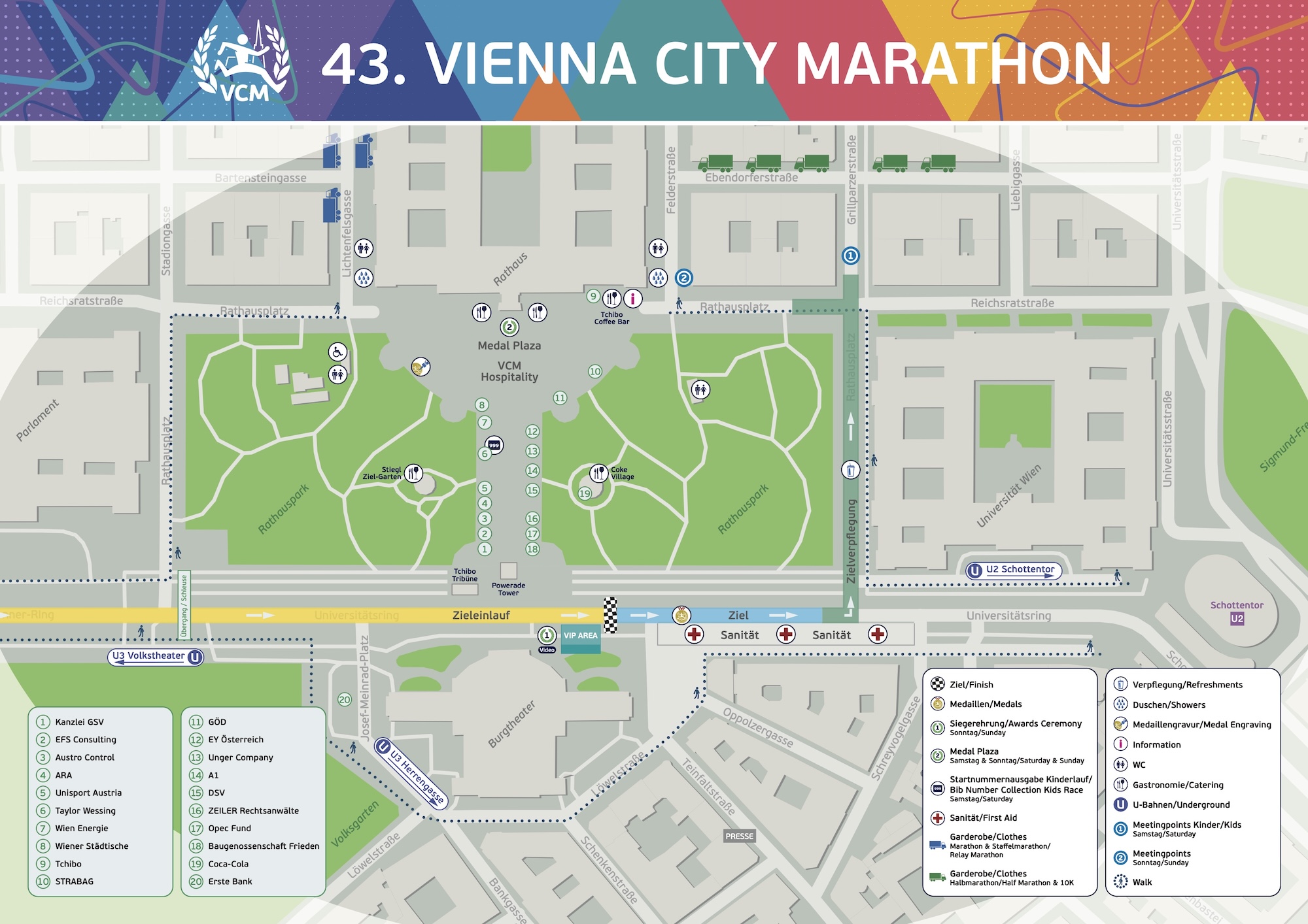 Hier findest du die Zielpläne für den Sonntag und für die einzelnen Bewerbe am Samstag: Gesamtübersicht, Wege, Garderoberückgabe, Duschen, Treffpunkte, Medaillengravur, Gastronomie, Bühnen, Hospitality und vieles mehr.Sonntag, 19. April 2026